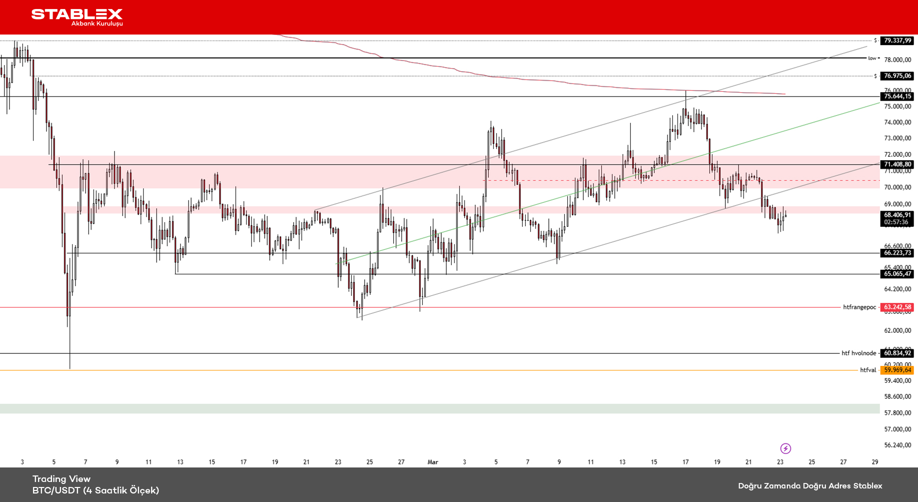 Teknik görünüme döndüğümüzde, trend kırılımlarının ardından fiyatın likiditenin yoğunlaştığı bölgelere yönelmesi klasik bir davranış olarak öne çıkar. Bu çerçevede, fiyatın 72.000 seviyesini yeniden kazanamaması durumunda satış baskısının derinleşmesi ve aşağıda 62.000 seviyesinin test edilmesi gündeme gelebilir. Bu bölgenin de alıcı desteği üretememesi hâlinde, bir sonraki önemli likidite alanı olan 58.000 seviyesi öne çıkmaktadır.