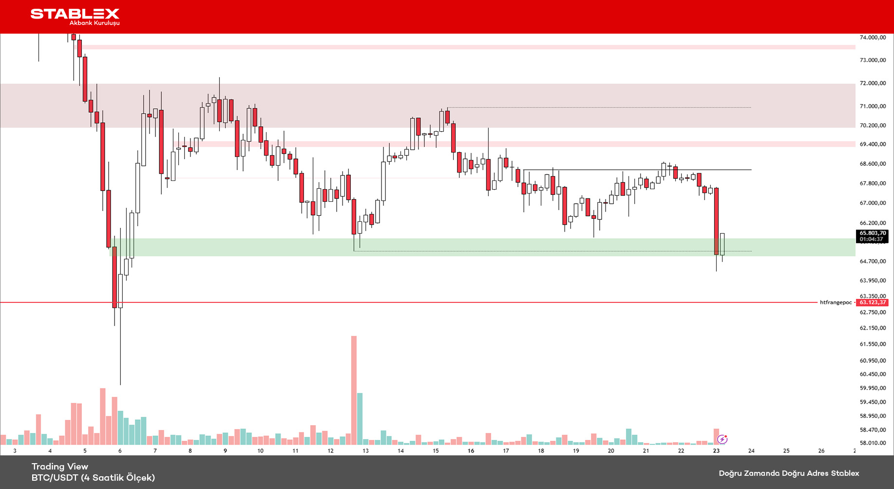 Bu yapı net biçimde bozulmadıkça yatay piyasa koşullarında trade amaçlı takip edilebilir. Ancak 65.000 seviyesinin kalıcı şekilde kaybedilmesi durumunda aşağıda sırasıyla 63.000 – 58.000 seviyeleri gündeme gelebilir.