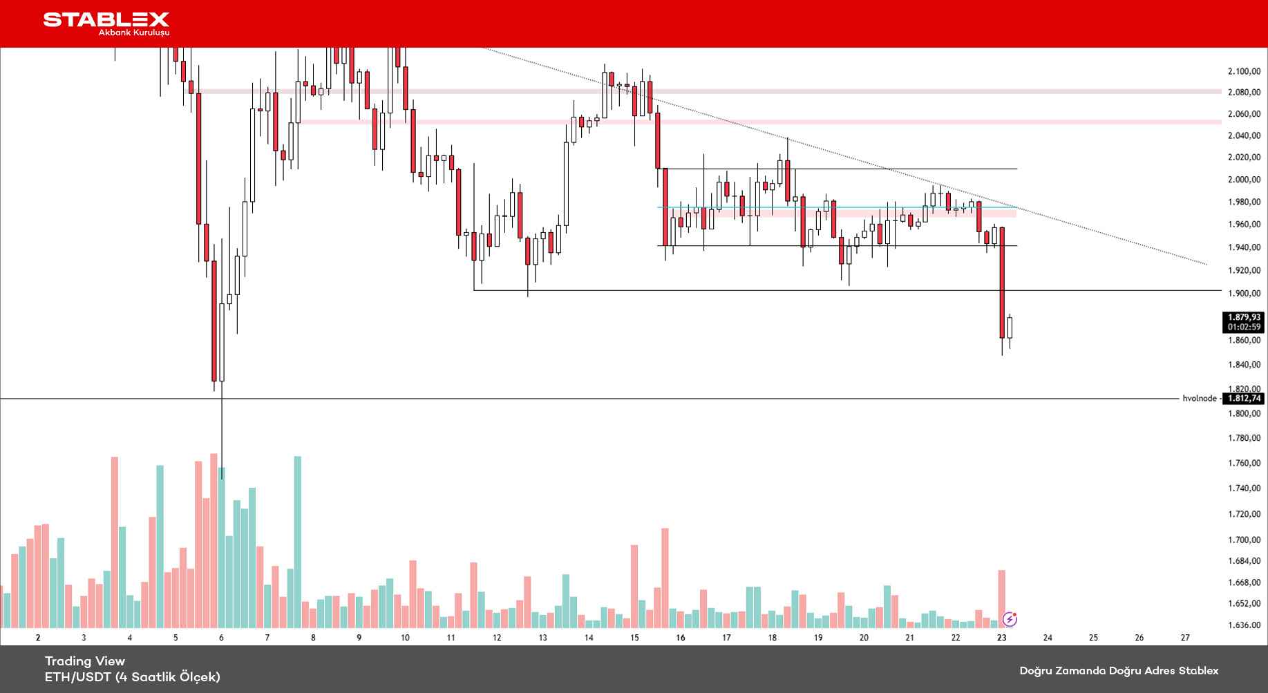 Ethereum, Bitcoin’e kıyasla daha zayıf bir performans sergileyerek düşüş eğilimini sürdürdü. Fiyatın daha önce üç kez destek olarak çalıştırdığı 1.900 seviyesi, pazar gecesi artan satış baskısıyla kırıldı ve parite 1.800’lü seviyeleri ziyaret etti. Bu noktada ana ayrım, fiyatın yeniden değer alanına (1900 bölgesi) dönüp dönemeyeceğinde oluşuyor: 1.900 seviyesinin hızlı şekilde geri kazanılamaması hâlinde aşağıda 1.700 bölgesi gündeme gelebilir. Buna karşılık, fiyatın 1900 ve 2.000 seviyesi üzerinde kapanışların gelmesi durumunda yukarıda 2.180 bölgesine doğru fiyatın yeniden alan genişletmesi mümkün hâle gelebilir.